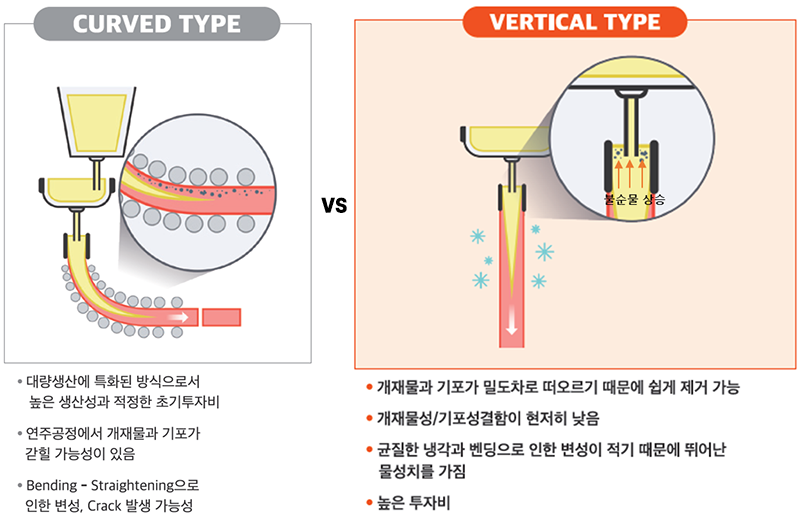 수직타입 주조방식의 가장 큰 장점은 고청정 블룸을 생산할 수 있다는 것입니다. 왜냐하면 주조 공정에서 용강은 중력방향으로 흐르기 때문에 용강 내 비금속 개재물이나 불필요한 기포들이 밀도차로 인해 분리되어 떠오르게 되기 때문입니다. 따라서, 불순물이 포함된 부분을 제거함으로써 고청정 블룸을 생산할 수 있습니다. 고청정 블룸은 압연 등의 후공정을 거치게 되며 철저한 품질검사 과정을 거쳐 높은 품질을 달성하게 됩니다.